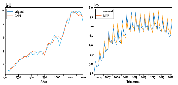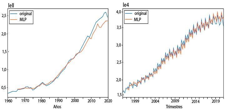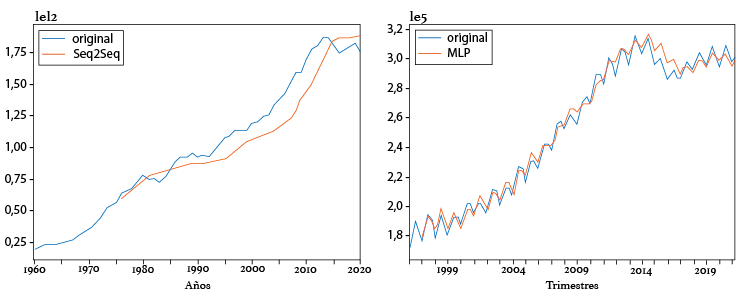 Se halló que los modelos CNN, MLP y Seq2Seq se desempeñan mejor en datos anuales, y que MLP supera a los demás en datos trimestrales. Mientras que, en la predicción del PBI, los modelos trimestrales se aproximan más al original, a excepción del caso de Perú (figura 27) que en el periodo de pandemia de Covid-19 no predice la crisis. Lo mismo sucede con los modelos anuales en las figuras 19, 23 y 27, al sobreestimar el último año que corresponde a la crisis.