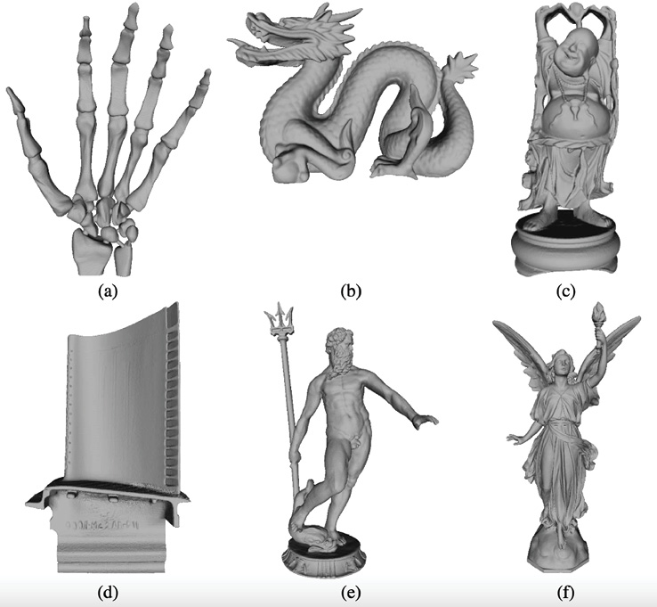 Note. The models were obtained from the Stanford 3D Scanning Repository, the AIM@SHAPE Shape Repository, and the GIT Large Geometry Models Archive. (a) Skeleton Hand. (b) Dragon. (c) Happy Buddha. (d) Turbine Blade. (e) Neptune. (f) Lucy.