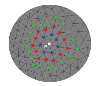 Note. White: evaluated vertex. Blue: 1-ring. Red: 2-ring. Green: 3-ring. Adapted from Harris 3D: a robust extension of the Harris operator for interest point detection on 3D meshes by I. Sipiran & B. Bustos, 2011, The Visual Computer, 27 (https://link.springer.com/content/pdf/10.1007/s00371-011-0610-y.pdf)