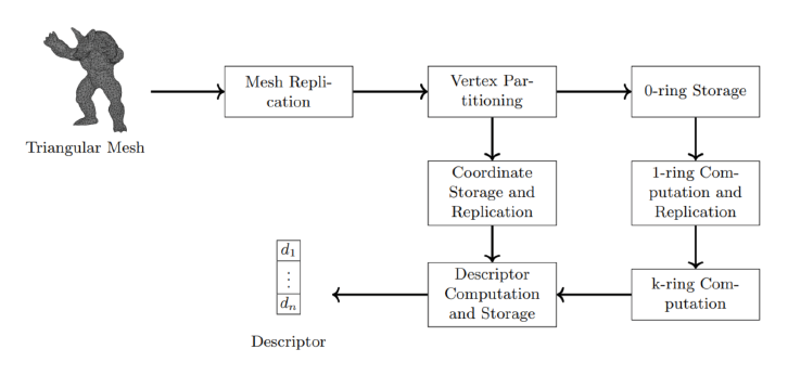 We address two problems: insufficient memory capacity and parallel processing. To solve the first one, our method uses disk I/O operations for final and temporal data, which is helpful for partial results storage. These operations are executed in parallel, on each node of the cluster. The second one is solved using a multi-process architecture. Our model consists of seven steps. The input is a 3D triangular mesh and the output, its respective descriptor. 1) Mesh replication: distributes the mesh file. 2) Vertex partitioning: regular partitioning using appearance order. 3) Coordinate storage and replication: extracts coordinates from mesh file and replicates them on each cluster node. 4) 0-ring storage: the 0-ring is integrated by the evaluated vertex. 5) 1-ring computation and replication: the 1-ring is integrated by the adjacent vertices, and it is replicated on all the cluster. 6) K-ring computation: the k-ring is computed using the (k-1)-ring, the (k-2)-ring and the 1-ring. 7) Descriptor computation and storage: using the computed rings we can load the coordinates for descriptor computation. The workflow of our model is shown in figure 2.