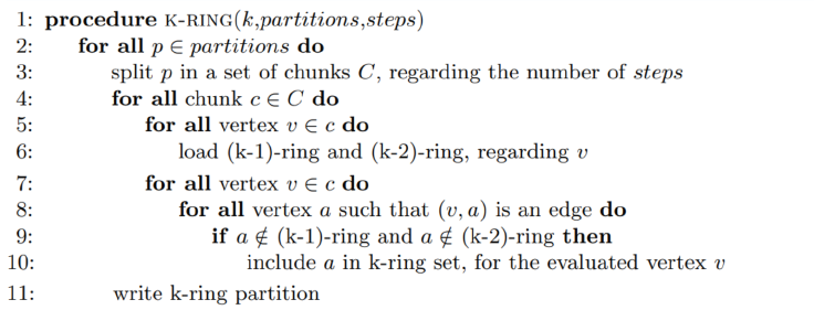 The next step is the computation of the k-rings. We make use of the 1-ring to obtain the adjacent vertices of a specific vertex. If we are computing the k-ring, we need to access to the (k-1)-ring and (k-2)-ring. We use the first one in order to get the adjacent vertices of the previous ring (external ring). And the second one because the adjacent vertices we select should not be in the rings that have already been computed. We use data structures to speed up this step. As in the previous steps, we assign a process for each partition and use sequential steps depending on the memory usage. We compute the k-rings sequentially regarding the partitions. Figure 3 shows in detail the algorithm used in this step .