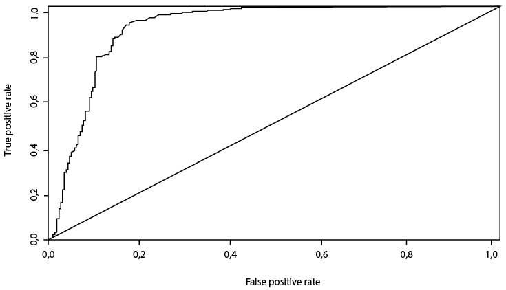 Nota. Área bajo la curva de la curva ROC para el modelo generado de regresión logística, cuyo resultado fue 0,9. De “Classical machine learning methods in economics research: Macro and micro level examples”, por V. Babenko, A. Panchyshyn, L. Zomchak, M. Nehrey, Z. Artym-Drohomyretska, y T. Lahotskyi, 2021, WSEAS Transactions on Business and Economics, 18, p. 213 ( https://doi.org/10.37394/23207.2021.18.22).
