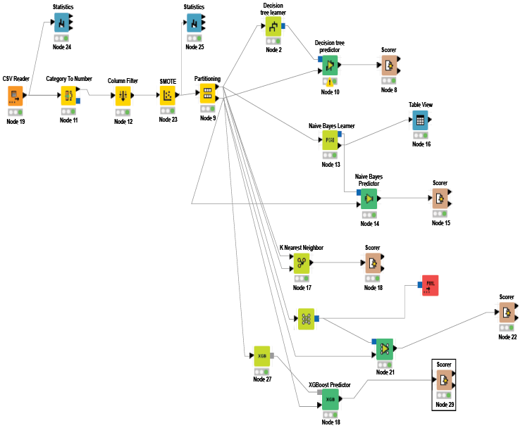 A partir del conjunto de datos definidos, se implementaron los modelos de decision tree, KNN, naive Bayes, ANN (RPROP) y XGBoost. Estos modelos fueron seleccionados con el objetivo de obtener el modelo predictivo de la mayor exactitud posible.