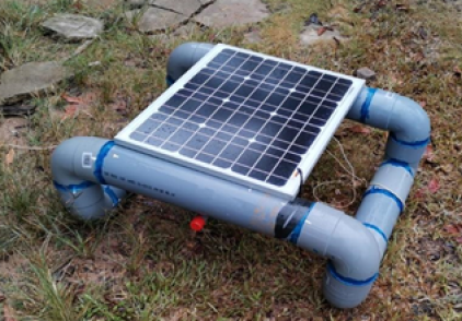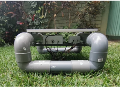 En línea con lo mencionado, se utilizaron dos cajas de derivación de 20 cm × 15,5 cm × 8 cm y de 10 cm × 10 cm × 7 cm para el dispositivo y componentes de alimentación de energía, implementando prensaestopas en las conexiones salientes, de tal forma que el agua no pueda ingresar dentro del dispositivo (véase la Figura 8). Asimismo, se decidió construir una estructura flotante que soporte todos los componentes del nodo de medición de parámetros. De esta forma, los sensores pueden ser ubicados en el centro de la poza y mantienen una profundidad constante en el agua, aunque el nivel de esta cambie. La estructura fue construida con tubos de PVC de 4 pulgadas sellados con pegamento para evitar el ingreso del agua. Asimismo, en el interior de los tubos, se insertaron botellas de plástico para que, en caso de ingreso de agua, esta no pueda hundir al dispositivo. De igual forma, se colocó un tubo de 1 pulgada que soportaba los componentes y el panel solar se instaló en la parte superior. Esta estructura se puede observar en las Figuras 9 y 10.