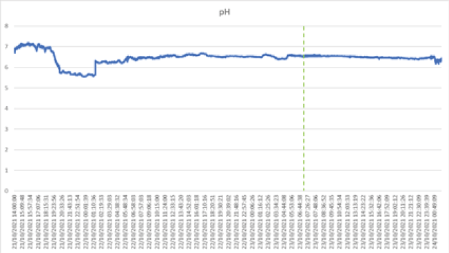 En la Figura 18 se observa que el sensor de pH muestra variaciones durante el primer día de medición. En los días posteriores, se mostraron datos estables hasta el fin del periodo de prueba. Estos datos se encontraron dentro del rango de 5,6 y 7,2 de pH.