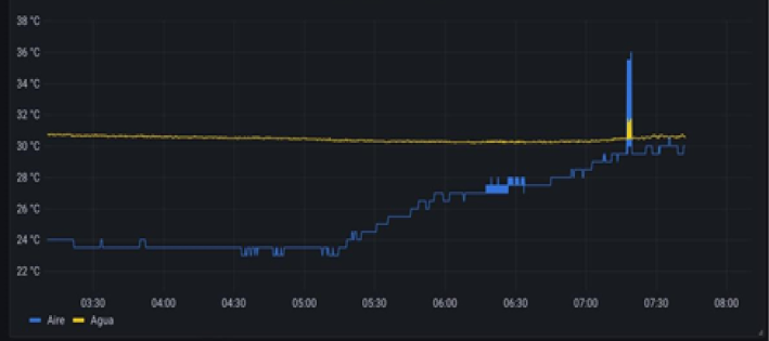 En la Figura 14 se observa que la temperatura del ambiente varía entre los 22 °C y los 36 °C, lo que genera una respuesta con la misma tendencia en la temperatura del agua, la cual varía en menor medida. Asimismo, se puede observar una drástica caída en la temperatura al final del gráfico, que pudo haberse ocasionado por la lluvia del lunes 25 de octubre por la mañana.