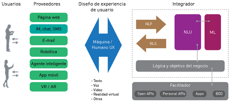 El proveedor es la interfaz con la cual el usuario entra en contacto con el chatbot; enseguida se encuentra una capa intermedia de experiencia de usuario (UX, por sus siglas en inglés), en donde se define cómo se mostrará y cómo se comunicará el chatbot con el usuario, puede ser mediante texto, imágenes o voz. El integrador es la pieza fundamental, ya que en él se encuentran las herramientas de procesamiento de lenguaje natural, machine learning y deep learning, que son la parte de inteligencia del chatbot.