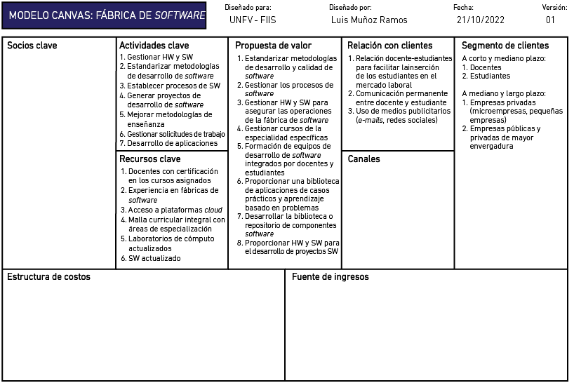 Para crear la fábrica de software en la Facultad de Ingeniería Industrial y de Sistemas (FIIS) de la UNFV, es recomendable representarla como un modelo de negocio gráfico que ilustre su funcionamiento futuro. Para ello, se utilizará el modelo Canvas, desarrollado por Osterwalder y Pigneur (2009), que destaca la importancia de diseñar el negocio en torno a una propuesta de valor que diferencie el producto o servicio de la competencia. El Canvas se divide en nueve bloques: propuesta de valor, segmento de clientes, canales de comunicación y distribución, relación con los clientes, fuentes de ingresos, recursos clave, actividades clave, alianzas clave y estructura de costos.