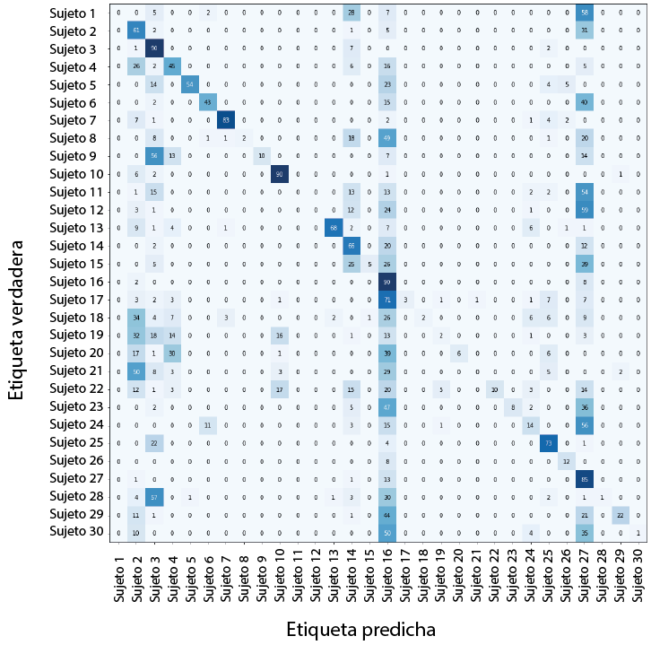 Matriz de confusión de modelos transformers con 30 sujetos en base segmentada: Swin Transformer