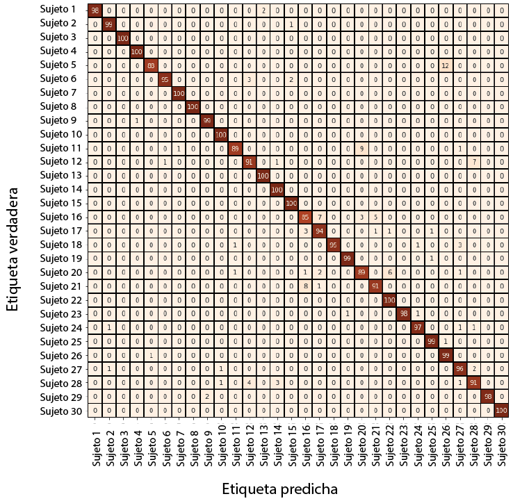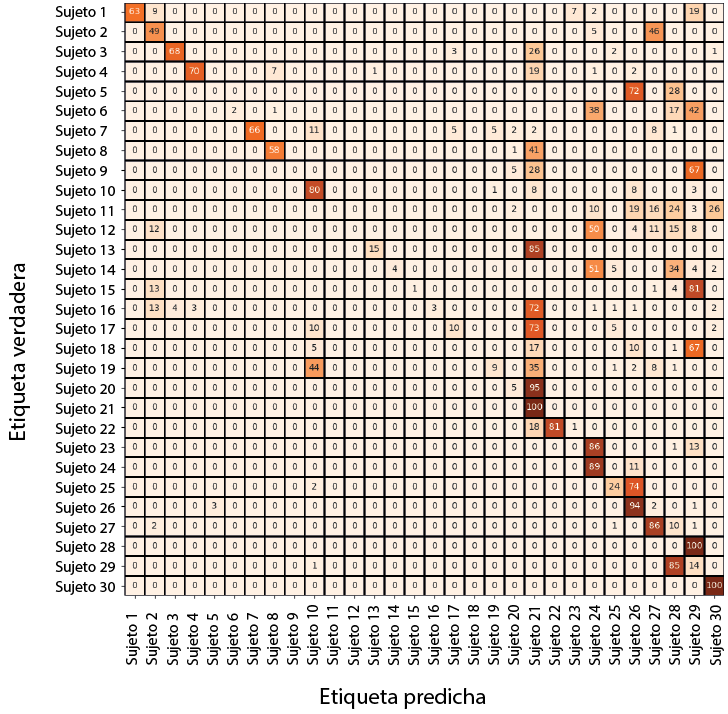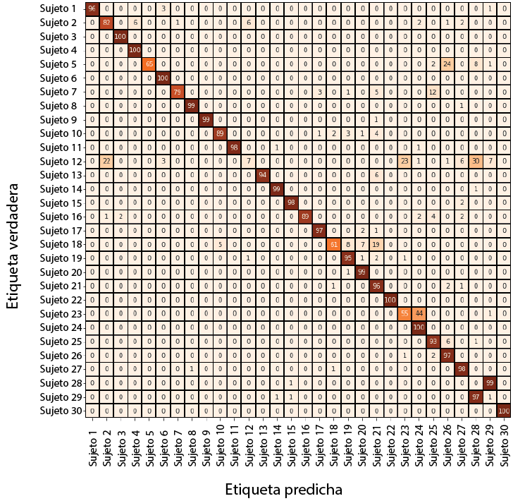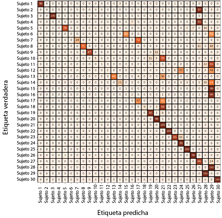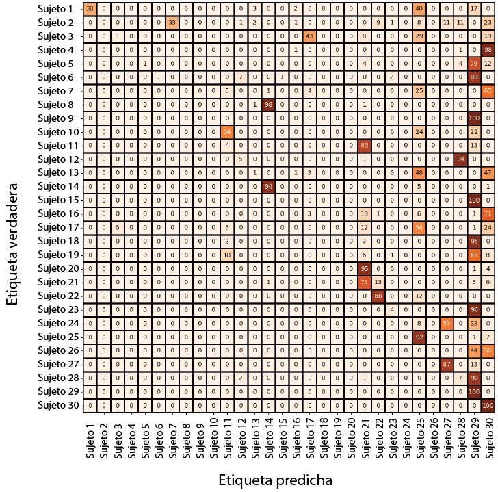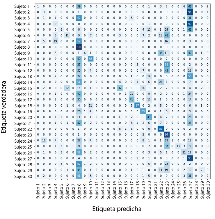 En el entrenamiento de VGG-16 sin mascarilla, se obtuvo un 25 % de testing accuracy. Además, la matriz de confusión muestra que el modelo solo se equivoca en algunos casos específicos, como con “Sujeto 8” y “Sujeto 27” (Figura 2). En el modelo con mascarilla, arrojó un testing accuracy de 53 %. Además, la matriz de confusión muestra que el modelo reconoce de forma consistente a la mayoría de los sujetos (Figura 3).
