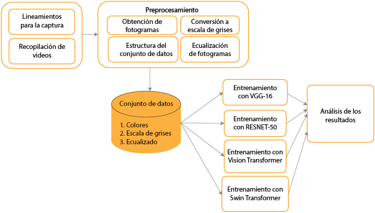 La investigación se inició con la definición de los lineamientos para la captura de videos. Una vez recolectados, comenzó la etapa del preprocesamiento de imágenes, donde se descompuso los videos en fotogramas. Luego, se dividió los tres conjuntos de datos que se tenía: imágenes a colores, a escalas de grises y ecualizadas1. Después de ello, se seleccionó solo el conjunto de datos con imágenes a colores para realizar el entrenamiento de dos redes neuronales convolucionales: VGG-16 y RESNET-50, un modelo de Vision Transformer y un modelo de Swin Transformer. Una vez que se obtuvieron los resultados de los modelos, se realizó un análisis comparativo. En la Figura 1 se puede apreciar cada una de las etapas.
