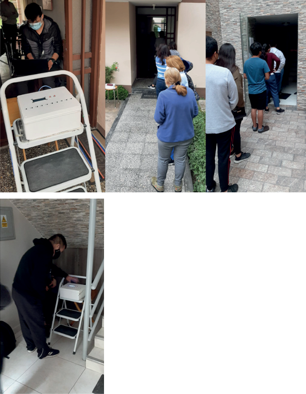 Se realizaron dos pruebas de mitigación en dos momentos del día, ambas con iguales condiciones y el mismo número de individuos: ocho personas. De este número de personas, en cada prueba, cuatro formaron parte del grupo 1 (usuarios) y otras cuatro integraron el grupo 2 (atacantes), dando un total de 16 personas distintas. Una vez que se tuvo a los grupos 1 y 2 separados, se procedió a explicar a cada uno la labor que debían realizar. Al grupo 1 se le volvió a instruir en el uso de la interfaz y se le brindó a cada integrante el PIN que deberán ingresar. Al grupo 2 se le reveló la verdadera naturaleza de la prueba y, en vez de brindarles un PIN que ingresar, se les encomendó la tarea de observar el PIN de la persona que tuvieran delante en la fila y memorizar los dígitos que lograran visualizar. Además, a los integrantes de este grupo se les solicitó que simularan hacer uso de la interfaz, pero sin ingresar ningún dígito realmente, pues la prueba de usabilidad a la que se los sometería después, requería que no hubieran usado antes la interfaz. Finalmente, se reunió a ambos grupos y se les colocó de forma intercalada en una fila para iniciar la prueba. En la Figura 13 pueden visualizarse fotos tomadas en ambas pruebas de mitigación realizadas. Cabe destacar que, una vez finalizada la prueba, se volvió a separar a los grupos, se brindó otro PIN a cada usuario y se volvió a realizar la prueba, es decir, se realizaron dos rondas del experimento.
