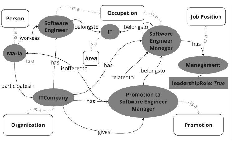 Figure 2 illustrates the knowledge graph of instances created from the following mini-scenario: Maria works in the field of Information Technology (IT) as a Software Engineer (Occupation) at ITCompany (Organization), where she has been offered to be promoted to Software Engineer Manager (Promotion Opportunity), a management-level role (Job Position) with a leadership function in the Software Engineering department (Organization). Having more instances like the one in Figure 2 would make it possible to determine, for example, whether the ITCompany organization has policies to promote leadership opportunities in computing/IT for women.