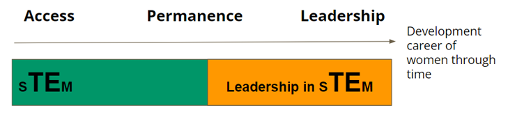 These points are critical in understanding that the development of Women’s careers in STEM over time is a continuous process that begins early in childhood and is met with access and permanence issues, both at the educational and professional levels, all the way to the top leadership positions in adulthood, as represented in Figure 1.