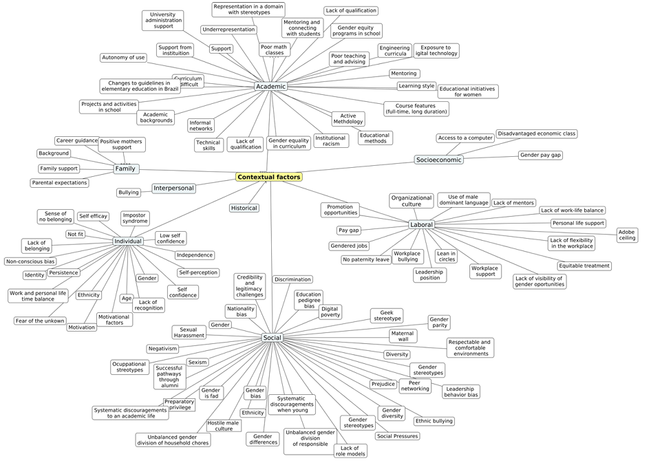 Eight (8) types of contextual factors were identified following the analysis of the papers: individual, interpersonal, academic, work-related, family-related, socioeconomic, social and historical; these factors comprise 196 sub-factors, which are laid out in Figure 2. These factors were later classified by impact type (positive or negative), to reflect whether they enable or constrain the development of women’s careers in technology and/or engineering, in order to answer the research questions.