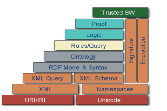 The World Wide Web Consortium (W3C) proposed a layered architecture for building applications that involve the semantic web. This architecture defines the standards, technologies, languages, and methods necessary to make web resources available including for machines (Cantele, 2009; Cantele, 2017). Figure 1 presents this architecture, proposed by the composition of layers, here highlighted between i) ontology and inference layer and ii) data layer.