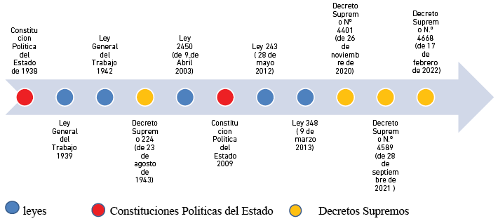 En la Figura 1 se pueden ver los avances en cuanto a la normativa laboral, a partir de las reformas constitucionales de 1938 y del 2009, pero también en cuanto a la Ley General del Trabajo de 1939 y, subsecuentemente, la de 1942, las cuales empezaron a regir la normativa laboral muy tempranamente y que, a través de decretos supremos posteriores, se fueron actualizando de forma constante.