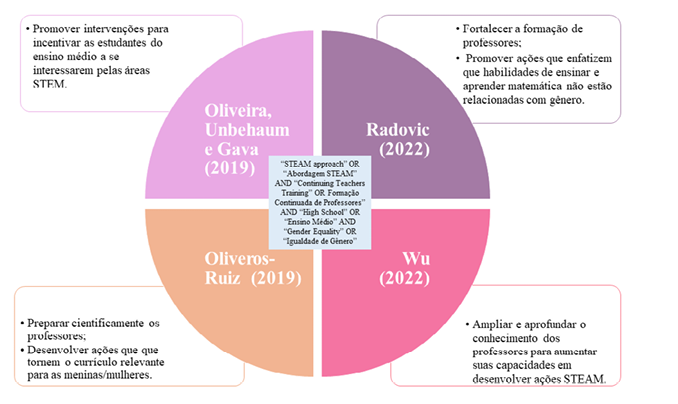 Esta seção se dedica a sistematizar e apresentar elementos centrais contidos em cada artigo pertencente a esta pesquisa, de modo a proceder uma interface entre as discussões. Nesse sentido, ao analisar os títulos e resumos dos artigos desta QSR, foi possível verificar que não há muitos estudos que relacionam a formação continuada e a abordagem STEAM. No entanto, dos 4 estudos analisados na íntegra, constata-se a importância de ações articuladas entre a formação continuada e a abordagem STEAM, conforme informações descritas a seguir pelos autores, em seus respectivos artigos.