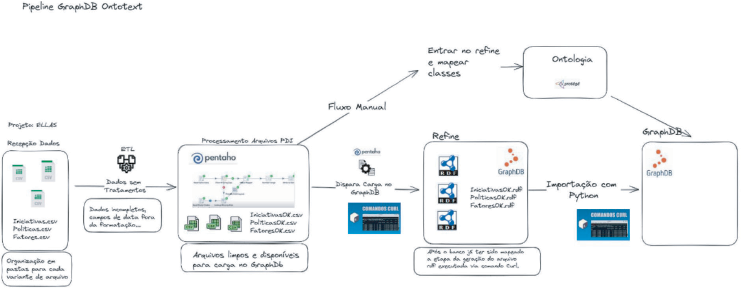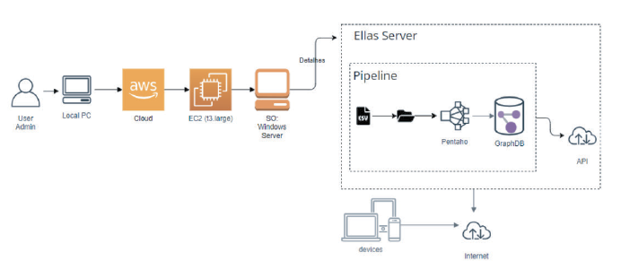 Até o momento foi realizado um piloto de configuração de um servidor na AWS paracomeçar a realizar alguns testes com o pipeline a ser desenvolvido. Para a instalação do GraphDB e do Pentaho Data Integration foi criado um servidor na AWS. Este servidor foi configurado com uma capacidade básica de 4 GB de RAM e está utilizando o sistema operacional Windows Server 2022. Foi instalada a versão 10.2 do GraphDB Desktop. Para permitir o acesso externo ao servidor, foi necessário liberar as portas 7200 e 7333 no firewall. Essa configuração permite que as conexões sejam estabelecidas com o GraphDB e o Pentaho Data Integration a partir de fontes externas, permitindo o gerenciamento destas plataformas, Na Figura 1 é possível visualizar de forma sintética como está projetada a proposta da Arquitetura e do Pipeline.