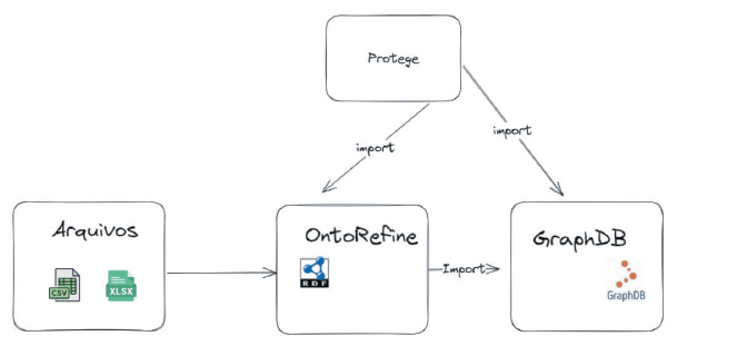 Inicialmente, o processo de importação de dados é realizado de forma manual, envolvendo a leitura de arquivos em formatos de planilha. Em seguida, esses dados são processados no Ontotext Refine3, em que são realizadas etapas de limpeza e mapeamento. Posteriormente, os dados são importados manualmente no formato RDF para o banco GraphDB. O processo de carga manual está ilustrado na Figura 2.