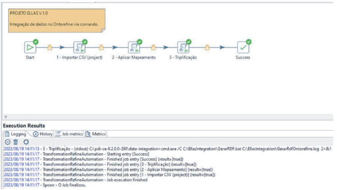 O projeto está em desenvolvimento e a proposta de integração automatizada foi simulada com uma amostra de 300 linhas de dados extraídos da literatura e estruturados pelos especialistas de domínio. Na integração dos arquivos do projeto foi utilizado o Pentaho Data Integration, aproveitou-se o mapeamento e a ontologia previamente estabelecidos para esta tarefa. O Pentaho localiza os arquivos no diretório especificado, inicia um projeto no Ontotext Refine através de um comando e aplica o mapeamento aos dados tabulares. Isso prepara os dados para a conversão em triplas RDF (Resource Description Framework), o formato compatível com o GraphDB. Após a geração do arquivo RDF, os dados são registrados com sucesso no banco de dados. O processo de orquestração pode ser visto na figura 5 e o exemplo da execução.