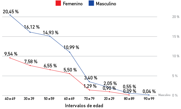En el nivel de investigador distinguido, en el que se esperaría encontrar a los investigadores más destacados y experimentados, la mayoría se encuentra en el rango de edades de 40 a 49 años. Sin embargo, la representación de mujeres en este nivel es mínima, con solo un 0,01 %, en comparación con el 0,15 % de hombres. Esto evidencia la brecha de género en los niveles más altos del RENACYT y plantea interrogantes sobre las barreras que enfrentan las mujeres para alcanzar el reconocimiento y la promoción en la investigación científica y tecnológica (Rivera-Lozada et al., 2022).