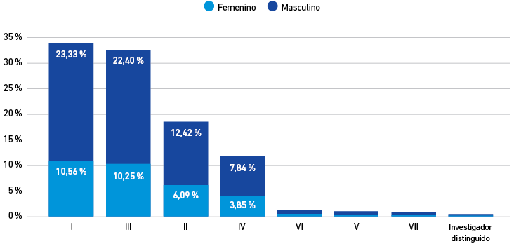 Por otro lado, se evidencia una disparidad de género significativa en los diferentes niveles del RENACYT. En todos los niveles de registro se observa una notable subrepresentación de mujeres, siendo esta brecha más pronunciada en los estratos más altos. Por ejemplo, en el nivel i, solo el 2,9 % de los registrados son mujeres, mientras que, en el nivel de investigador distinguido, este porcentaje desciende a un meramente simbólico 0,01 %.