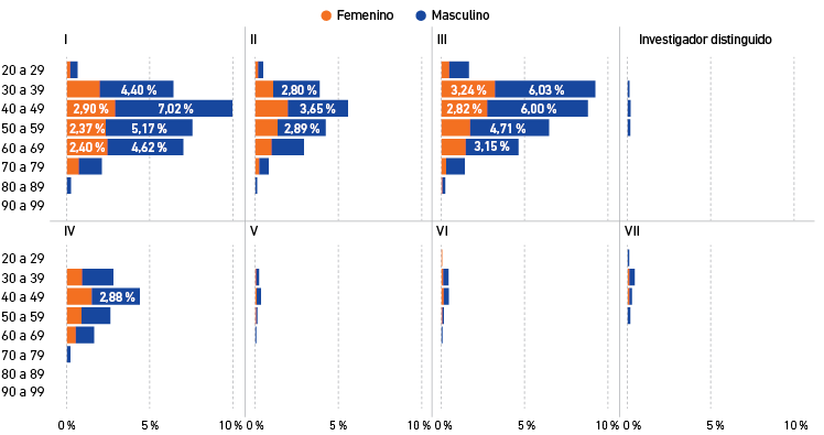 En la Figura 3 puede observarse que en el nivel i las mujeres representan 2,9 % y los varones 7,02 % del total. En el nivel iii, en el que la mayoría de profesionales se encuentra en el rango de edades de 30 a 39 años, 3,24 % son mujeres y 6,03 % varones. En el nivel de investigador distinguido, la mayor parte tiene entre 40 a 49 años, con 0,01 % de mujeres y 0,15 % varones. Los datos adicionales revelan una disparidad significativa en la representación de género en diferentes niveles del RENACYT. Específicamente en el nivel I, en el que se espera que se encuentren los investigadores más destacados, las mujeres representan solo el 2,9 %, mientras que los hombres constituyen el 7,02 % del total. Esta brecha de género en el nivel inicial del RENACYT es preocupante y refleja desafíos persistentes en la inclusión y el reconocimiento de las mujeres en la investigación científica y tecnológica.