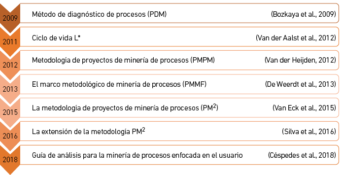 Para llevar a cabo proyectos de MP prácticos y científicos en distintos contextos, se han utilizado diversos enfoques metodológicos que han surgido desde la aparición de esta disciplina. Algunos de estos enfoques inician directamente con la preparación de datos hasta llegar a la presentación de resultados: por ejemplo, el método de diagnóstico de procesos o PDM (Bozkaya et al., 2009) y el marco metodológico de minería de procesos o PMMF, por sus siglas en inglés (De Weerdt et al., 2013). Otros enfoques metodológicos abarcan desde la planeación hasta la implementación de mejoras y soporte del proceso: el ciclo de vida L* (Van der Aalst et al., 2012), la metodología de proyectos de minería de procesos o PMPM (Van der Heijden, 2012), la metodología de proyectos de minería de procesos (PM2) (Van Eck et al., 2015), la extensión de la metodología PM2 (Silva Osses et al., 2016) y la guía de análisis para la MP enfocada en el usuario (Céspedes et al., 2018).