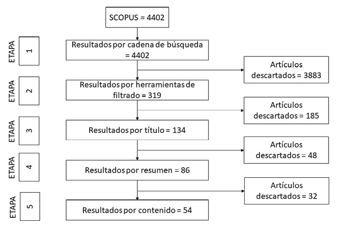 A partir de la cadena de búsqueda, durante la primera etapa del cribado, se seleccionaron 4402 artículos. La segunda etapa se realizó utilizando las herramientas disponibles por la base de datos de Scopus y considerando los criterios definidos en la Tabla 1, donde se optaron por 319 artículos. Para la tercera etapa, se revisaron títulos referentes al tema de control de tráfico, donde quedaron 134 artículos. Luego, se realizó una revisión del resumen para asegurar la relevancia y utilidad de los artículos, que resultó así en 86 artículos seleccionados. Finalmente, se efectuó la lectura del texto completo del artículo, donde se eligieron 54 de ellos. A continuación, se resume el proceso de selección y cribado en la Figura 1.