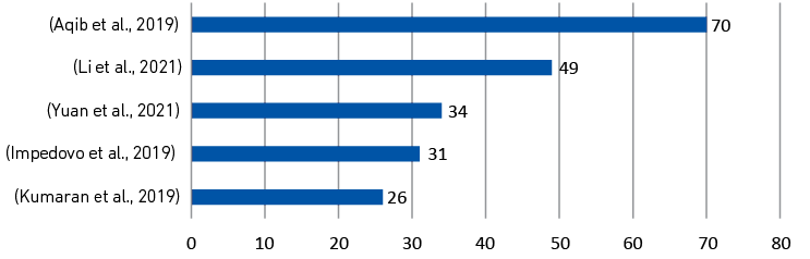 La Figura 5 expone los cinco artículos con mayor cantidad de citaciones en otros trabajos. El más citado tiene 70; el segundo lugar, 49, y el tercero, 34. Todos son citados al menos una vez por algún autor. Siete trabajos cuentan con solo una citación. Se determina a través del gráfico que existen múltiples citaciones, lo cual demuestra el interés en los temas tratados.