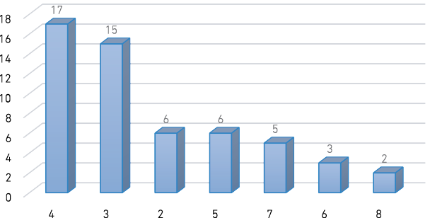 La Figura 6 presenta el número de artículos publicados según la cantidad de autores. Se evidencian 17 publicaciones con cuatro autores, 15 con tres autores y también 2 trabajos con ocho autores cada uno. Ningún trabajo cuenta con solo un autor. De esta forma, se manifiesta que alrededor del tema de control inteligente de tráfico existe una mayor colaboración entre varios investigadores. Esto podría indicar que una solución inteligente para el problema de control de tráfico resulta lo suficientemente compleja como para necesitar varios especialistas de diversos enfoques y áreas.