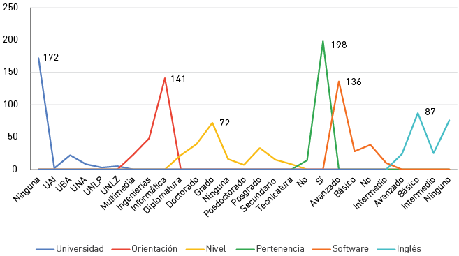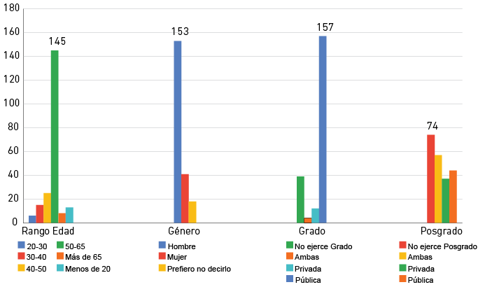 A partir de las respuestas se puede inferir, efectuando un análisis de Pareto (Sales, 2021), que la gran mayoría de la población entrevistada corresponde a personas de género masculino, en un rango de 50 a 65 años, con experiencia en enseñanza en carreras de grado en universidades públicas y sin experiencia en enseñanza en carreras de posgrado. Aquellos que sí tienen esa experiencia, en su mayoría, la adquirieron tanto en universidades privadas como en públicas.