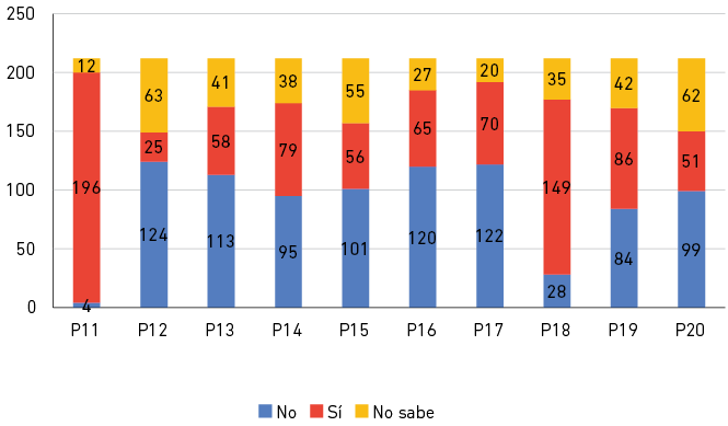 Seguidamente, se muestran en la Figura 3 los resultados obtenidos para las preguntas que van de la 11 a la 20 (P11-P20).