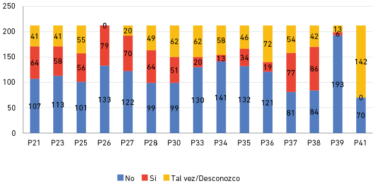 Este grupo, que abarca las preguntas 21 a 41 (P21-P41) corresponde al tipo de vínculo entre universidad e industria y a sus connotaciones. A continuación, se muestra la Figura 4, en la que se detallan las respuestas a todas las preguntas tricotómicas (Sí, No, Tal vez/Desconozco) de este grupo de interrogantes.