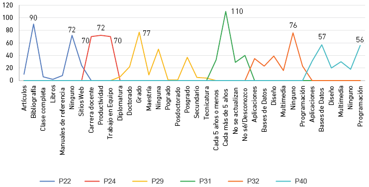 En la Figura 5, en la pregunta sobre cuál es el principal contenido en inglés impartido en las clases, mayormente las de grado, la mayoría de las respuestas hace referencia a la bibliografía. Sobre qué características son importantes a la hora de evaluar las acciones de un colaborador docente, la mayoría se inclina (muy ligeramente) por la productividad, aunque las otras opciones son votadas parejamente también. Se contesta mayoritariamente que los planes de estudio se actualizan con una frecuencia mayor a los cinco años. Además, la mayoría de entrevistados opina que no se imparten suficientes contenidos sobre software en las materias optativas y que la mayor oferta de estas se encuentra relacionada con bases de datos.
