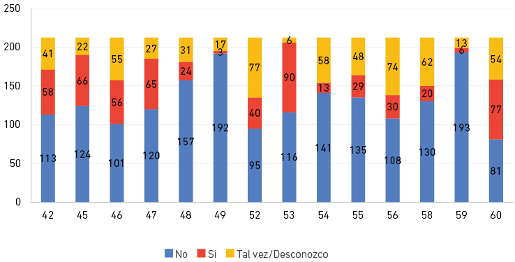 Los datos obtenidos en las entrevistas que dan lugar a la Figura 12 sugieren que, en promedio consolidado para todo el grupo, el 62 % de los entrevistados desconoce las iniciativas de integración con la industria o gobierno (y además no está conforme con ellas), mientras que solo el 13 % afirma conocerlas en detalle y, además, estar de acuerdo con ellas. A su vez, la cuarta parte de la población entrevistada manifiesta tener un conocimiento parcial o nulo y, por ende, carece de opinión formada al respecto.