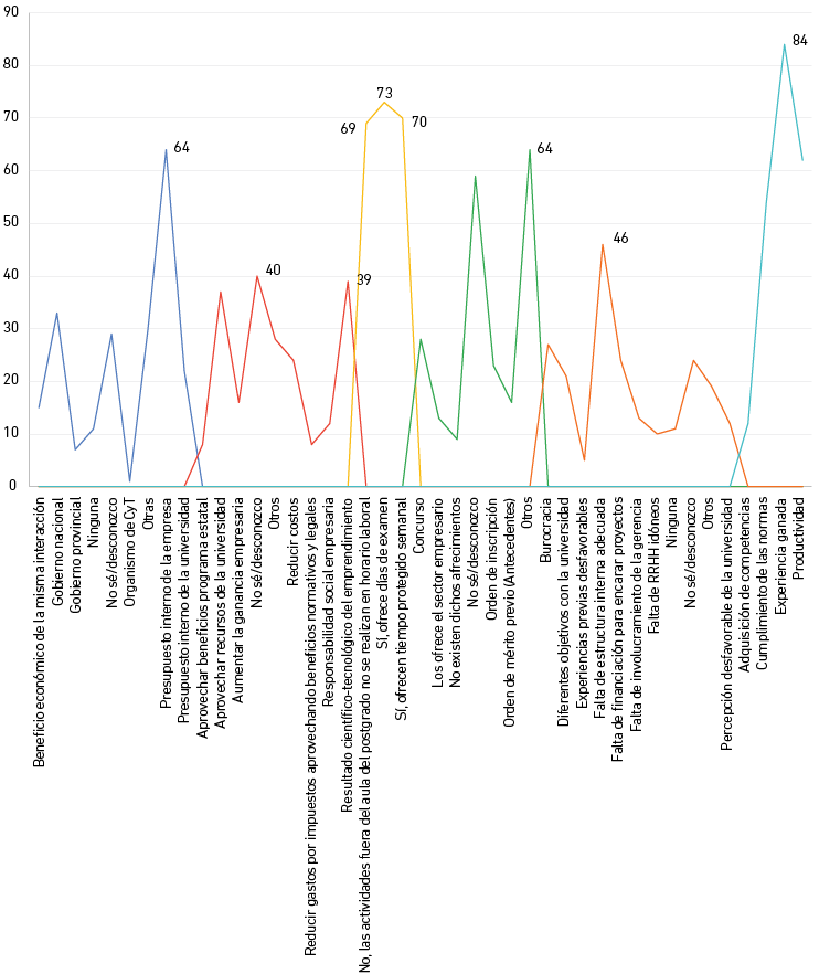 Se puede ver que, como principal fuente de financiación de los proyectos, se hace referencia en primer lugar al presupuesto interno de la empresa, seguido por otros ítems. Sobre cuál sería el principal objetivo de los proyectos de vinculación entre el sistema científico-tecnológico y la empresa, una gran parte se inclina (muy ligeramente, entre muchos otros ítems) por el aprovechamiento de los recursos de la universidad, como así también —en casi igual medida— por el resultado científico-tecnológico del emprendimiento. Sin embargo, la mayoría de los entrevistados expresa su ignorancia o desconocimiento al respecto. Se destaca, por otra parte, que las empresas ofrecen días libres para examen a los estudiantes (P50). La mayoría manifiesta no conocer cómo se cubren las necesidades de capacitación. La falta de estructura interna adecuada en la universidad es identificada como la principal dificultad para vincularse con las empresas. En lo que respecta a las características que deben considerarse para evaluar el desempeño de un alumno pasante en una empresa, la mayoría de los entrevistados se inclina por la adquisición de competencias, por sobre el cumplimiento de las normas industriales, la experiencia ganada y la productividad.