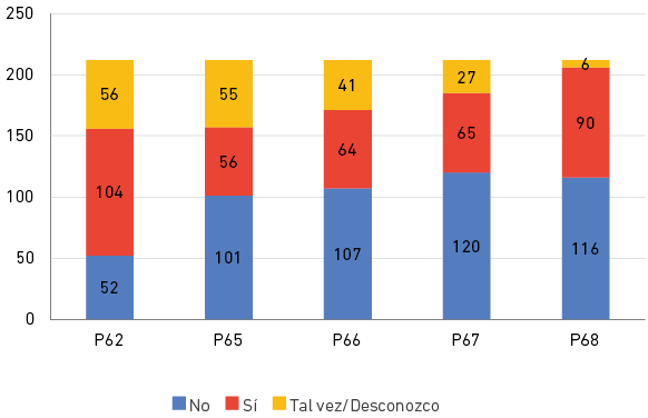 El grupo 6 (P62-P68) concierne también al vínculo entre universidad e industria y la formación misma de SO. En la Figura 8 se presentan las respuestas a todas las preguntas tricotómicas de este grupo.