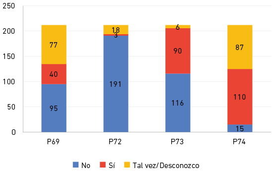 La Figura 11 representa la distribución de las respuestas obtenidas a las restantes preguntas del grupo 7; es decir, P70, P71, P75 y P78.