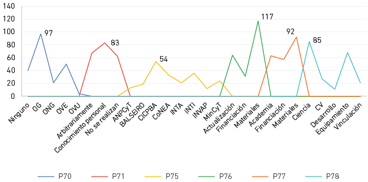 La figura muestra que la mayoría hizo referencia a las organizaciones gubernamentales como agentes para realizar convenios con la industria. Sobre cuál sería el procedimiento básico para realizar estos convenios, una gran parte se inclina por los contactos personales. Respecto del conocimiento de organizaciones científicas (más allá del CONICET), la más mencionada es la Comisión de Investigaciones Científicas de la Provincia de Buenos Aires (CICPBA). En relación a las motivaciones de un investigador para relacionarse con las empresas, se señala mayoritariamente el acceso a materiales, al igual que pasa con las motivaciones de un empresario para relacionarse con los organismos de investigación. Por último, acerca de cómo debería evaluarse la actividad de un investigador, se destaca su eventual contribución a la ciencia.