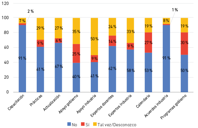 Se ve en la Figura 13 que los grados de aprobación más bajos están relacionados con los programas de capacitación docente sobre la situación de la industria y su relación con la universidad, así como con los acuerdos de prácticas sistemáticas y orgánicas con la industria (91 % de respuestas negativas en ambos grupos, mientras que el promedio de respuestas negativas del grupo ronda, como se acaba de señalar en la Figura 12, el 62 %). Mientras tanto, las respuestas afirmativas a las mismas preguntas son, respectivamente, de 2 % y 1 % (frente al ya señalado promedio del 13 %, según se ilustra en la Figura 12), lo cual indica que los docentes entrevistados consideran ampliamente que existen falencias en ambas cuestiones.
