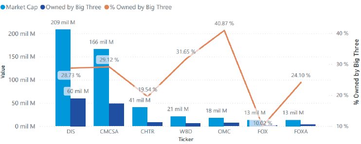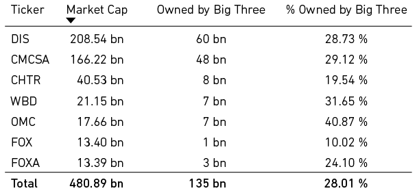 Table 6 not only shows individual investment in big media corporations, but also the total value invested by the Big Three as a whole. The Top 3 asset managers possess 28.73 % of all big media firms, worth $135 billion.