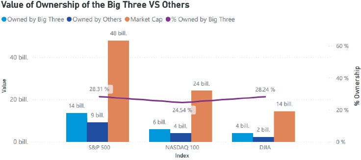 As of March 2024, the Big Three command formidable influence, holding 28.31 % of the total market value of S&P 500, 24.54 % of NASDAQ 100, and 28.24 % of DJIA. This substantial ownership underscores the undeniable level of power and influence they wield to advance their interests.