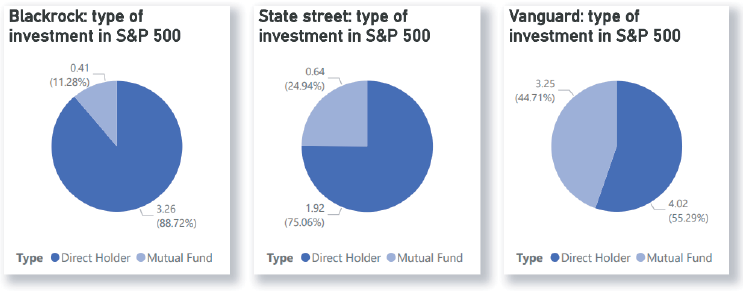 Lund and Robertson (2023) refer to the Big Three as passive investors. Figure 9 illustrates the type of investment that each of the Big Three has in the S&P 500 companies. Direct Holder refers to a company investing in a particular asset as an active investor, whereas Mutual Funds is related to a passive investment strategy. Contrary to the author’s statement, data shows that the largest assets managers in the world prefer active investing over passive investing. The asset manager with the highest proportion of its portfolio invested using active investment is BlackRock with 88.72 %, followed by State Street Corporation with 75.06 % and lastly Vanguard Group Inc with 55.29 %. Based on the data, Lund and Robertson’s statement on big asset managers and passive investment lacks support.