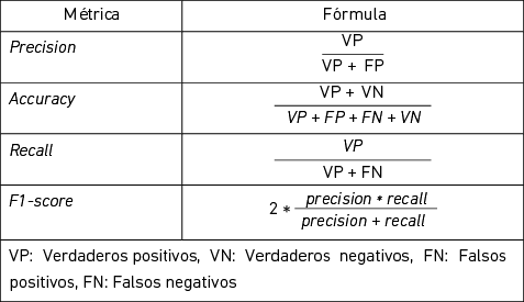 Para evaluar los modelos obtenidos con los tres algoritmos, se utilizaron las siguientes métricas: precision, accuracy, recall y F1-score; las fórmulas se muestran en la Tabla 4. Además, se crearon la matriz de confusión y el reporte de clasificación con ayuda de la librería sklearn.metrics.