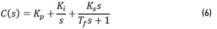 En la ecuación (6), KP es considerada como la ganancia proporcional, Ki, como la ganancia integral, Kd, como la ganancia derivativa y Tf, como el tiempo del filtro derivativo.