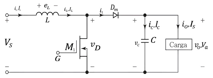 Los convertidores elevadores, como se muestra en la Figura 1, son una clase de convertidor DC/DC de potencia que poseen, como característica principal, la propiedad de convertir un voltaje de entrada, en corriente continua, a uno de salida de igual o mayor valor. Aunque existen diversos modelos de elevadores, estos generalmente están compuestos por elementos estáticos de potencia (interruptores, diodos, inductores, condensadores y cargas) debido a que posibilitan el uso de altas frecuencias para lograr bajas pérdidas durante su funcionamiento.