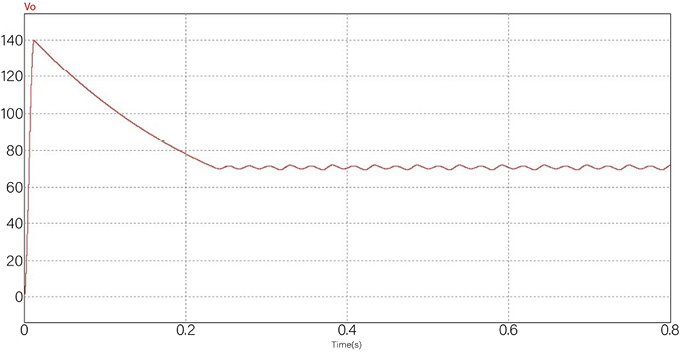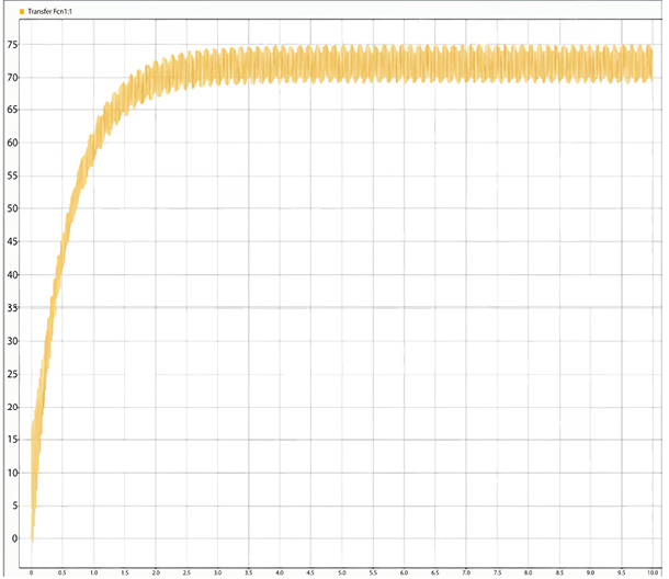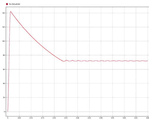 En la Figura 8 se presenta la representación gráfica de la función obtenida, considerando los valores de las ganancias y el PID en retroalimentación. Como se observa en la figura, el resultado que se obtiene es que la señal de salida se estabiliza aproximadamente en 72 V.
