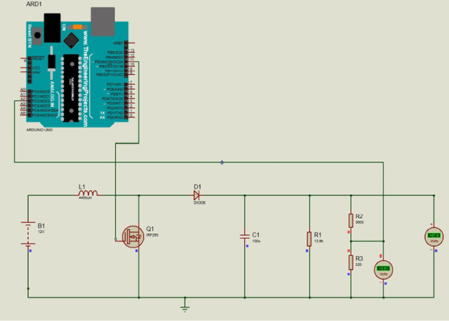 Como parte de las pruebas en simulación, se elaboró un código en Arduino, considerando las ganancias halladas, con el objetivo de probar su funcionamiento en el software Proteus y poder tener una idea de lo que podríamos obtener una vez se implemente el circuito. Debido a que el software nos solicitaba utilizar un modelo predeterminado de MOSFET para el desarrollo de la simulación, se optó por utilizar el modelo IRF250 debido a su gran capacidad de estabilidad ante altos voltajes y su resistencia a altas temperaturas, ya que se había tomado en consideración que, debido a las altas corrientes que iban a pasar por el circuito, la temperatura del componente iba a aumentar. La Figura 9 muestra el voltaje de salida obtenido una vez que se subió el código al entorno de Proteus.
